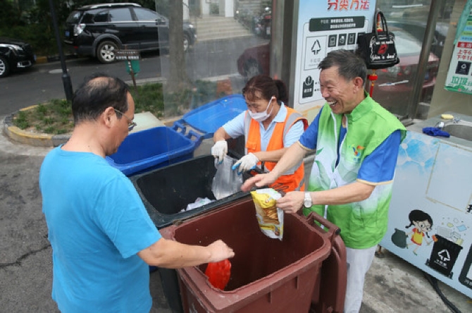 上海閔行區(qū)馬橋鎮(zhèn)夏朵園小區(qū)業(yè)委會主任陳錫賢(右)在指導(dǎo)小區(qū)居民分類投放垃圾(7月25日攝)。新華社發(fā)(王翔 攝)