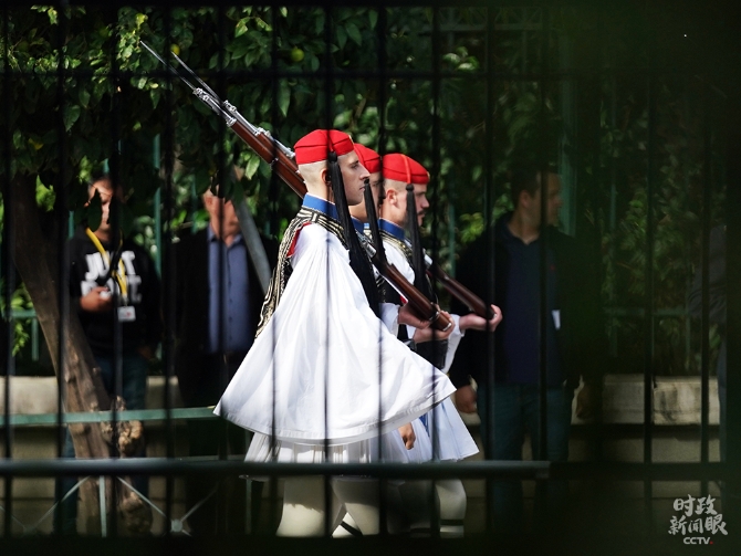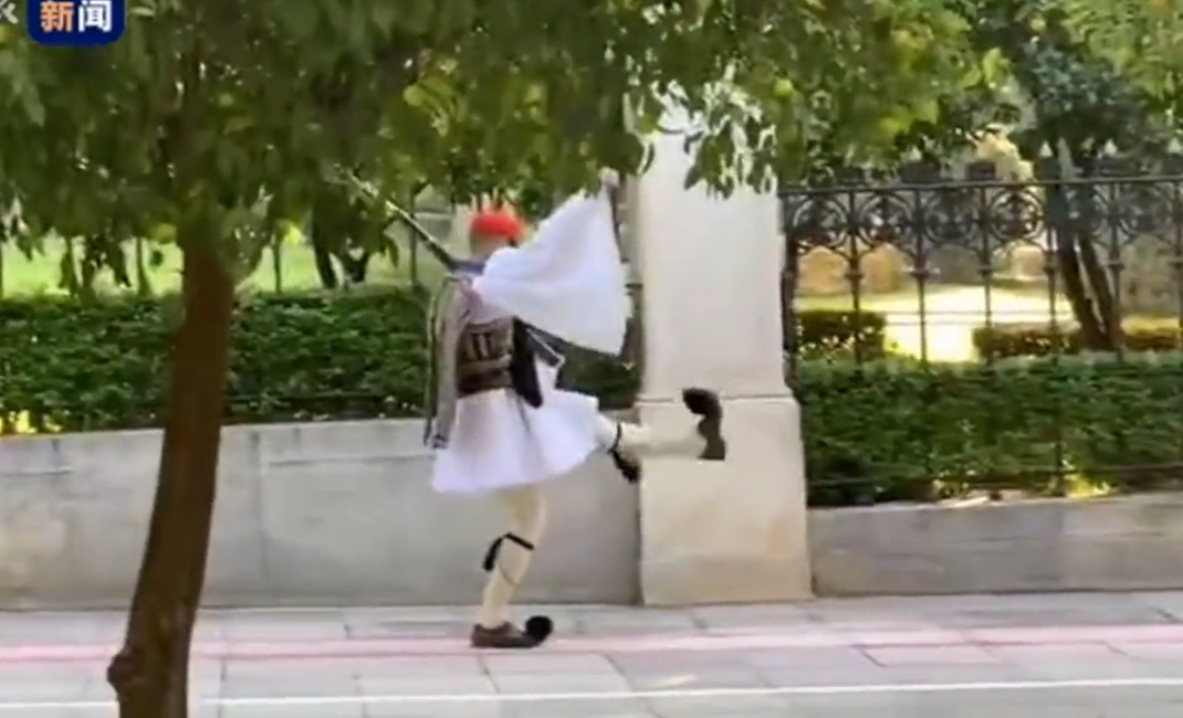 △希臘總統(tǒng)衛(wèi)隊的另一大特色,是他們的標(biāo)志性慢節(jié)奏動作。(央視記者郭晗光拍攝)