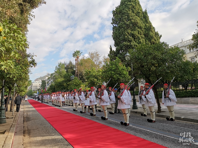 △歡迎儀式上的希臘總統(tǒng)衛(wèi)隊,他們的制服別具特色。(國廣記者李晉拍攝)