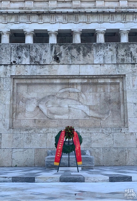 △當(dāng)天,習(xí)近平向希臘無名戰(zhàn)士紀(jì)念碑獻(xiàn)花圈。(央視記者段德文拍攝)