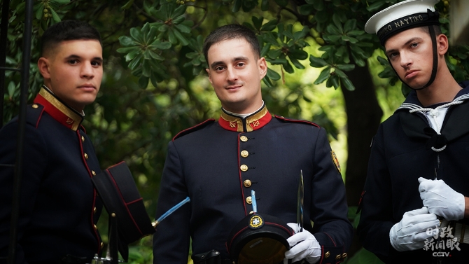 △歡迎儀式開始前,儀仗兵身著傳統(tǒng)禮服整裝列隊。(央視記者王曉東拍攝)