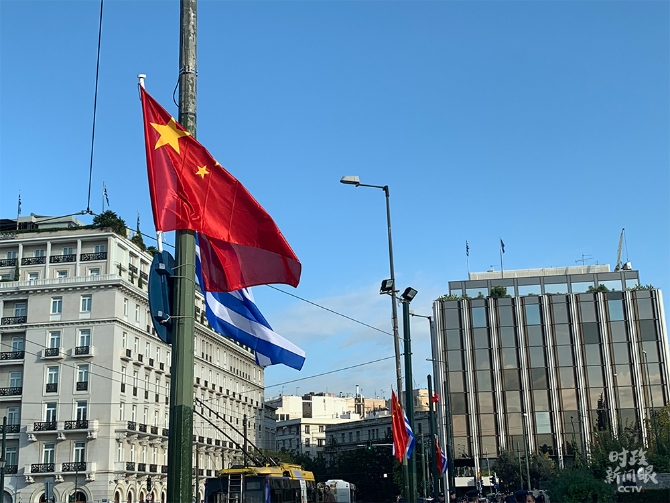 △雅典街頭的中希兩國國旗。(央視記者石丞拍攝)