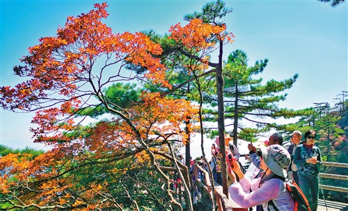 ?秋日的黃山色彩斑斕,青松與紅葉輝映,引得游客紛紛駐足。 張濤攝(中經(jīng)視覺)