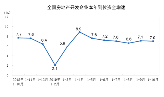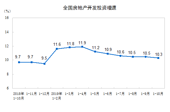 2019年1—10月份,全國房地產(chǎn)開發(fā)投資109603億元,同比增長10.3%,增速比1—9月份回落0.2個百分點。其中,住宅投資80666億元,增長14.6%,增速回落0.3個百分點。