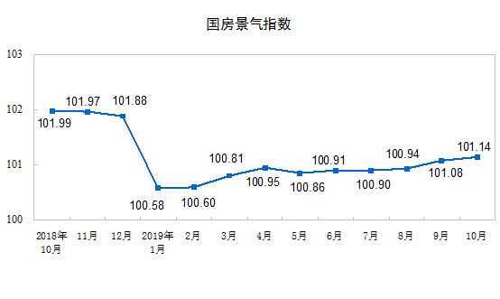 10月份,房地產(chǎn)開發(fā)景氣指數(shù)(簡稱“國房景氣指數(shù)”)為101.14,比9月份提高0.06點。
