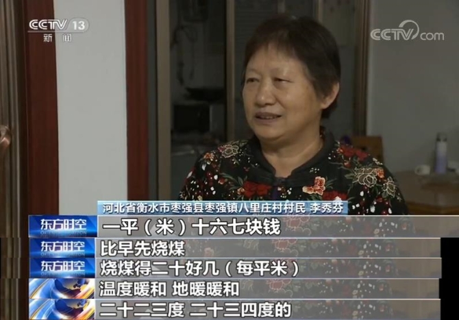 河北省遵化市南山村村民 徐維茹說,一年取暖燒煤得3000塊錢開支,還不安全?,F(xiàn)在2000多塊錢就夠了。