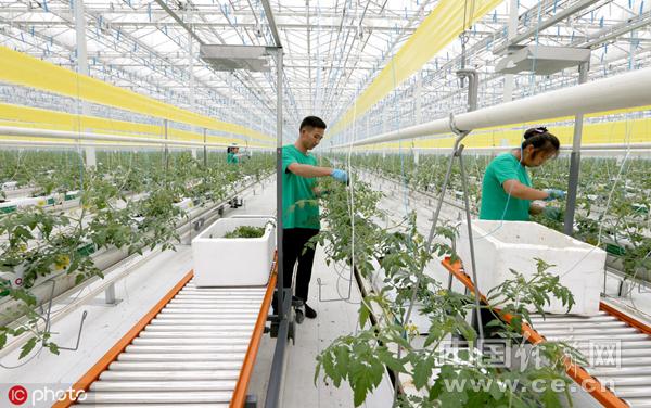 2019年10月7日,四川省眉山市岷江現(xiàn)代農(nóng)業(yè)示范園區(qū)東坡片區(qū)的“西南智慧農(nóng)業(yè)項目”現(xiàn)場,農(nóng)業(yè)工人在大棚內(nèi)管理番茄苗。(圖片來源:東方IC)
