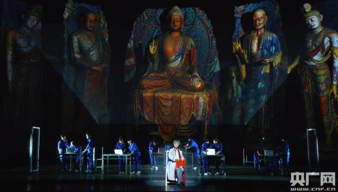 樊錦詩的飾演者茅善玉表示,相比去年在北大的演出版本,今年《敦煌兒女》在“數(shù)字敦煌”部分的舞臺表現(xiàn)上做了新的探索。大漠、飛天、臥佛、禪定佛陀等敦煌元素通過多媒體投影呈現(xiàn)于舞臺,讓觀眾更直觀的看到了壁畫是如何通過精密的數(shù)據(jù)完整保存下來,也讓大家更了解了樊錦詩在“數(shù)字敦煌”上作出的巨大貢獻。