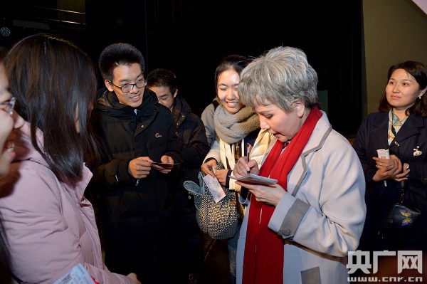 圖為著名滬劇表演藝術(shù)家茅善玉為青年學(xué)子簽名留念。央廣網(wǎng)發(fā) 上海滬劇院供圖