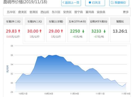 中國養(yǎng)豬網(wǎng)豬價(jià)系統(tǒng)監(jiān)測顯示,從11月開始,昆明生豬價(jià)格開始下降。11月14日至18日,生豬(土雜豬)每公斤均價(jià)都在30元以下運(yùn)行,17日已降至27元/公斤;11月16日至18日,生豬(外三元)每公斤均價(jià)也是在29.17元至29.83元之間運(yùn)行;11月14日、17日,生豬(內(nèi)三元))每公斤均價(jià)也跌至29元/公斤。這個(gè)價(jià)格與10月最高價(jià)相比,每公斤已下調(diào)了7元左右。