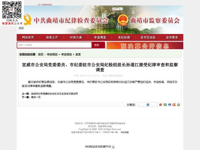 昆明信息港訊 機(jī)器人小明 據(jù)宣威市紀(jì)委監(jiān)委消息:宣威市公安局黨委委員、市紀(jì)委駐市公安局紀(jì)檢組組長(zhǎng)孫道江涉嫌嚴(yán)重違紀(jì)違法,主動(dòng)投案,目前正在接受紀(jì)律審查和監(jiān)察調(diào)查。(本文由昆明信息港寫稿機(jī)器人小明根據(jù)曲靖市紀(jì)委網(wǎng)站數(shù)據(jù)自動(dòng)合成發(fā)布)