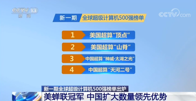 全球超級計算機500強榜單始于1993年,由國際組織“TOP500”編制,每半年發(fā)布一次,是給全球已安裝的超級計算機排座次的知名榜單。中美兩國在超算領(lǐng)域你追我趕的態(tài)勢已持續(xù)數(shù)年。中國的“神威·太湖之光”曾多次奪得冠軍,美國“頂點”在2018年6月首次登頂后已連續(xù)四次奪冠。