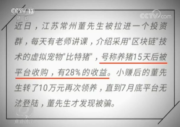 利用區(qū)塊鏈概念搞資金盤,圈點(diǎn)錢就跑路,這樣簡(jiǎn)單的騙局相對(duì)還好識(shí)破,但有些項(xiàng)目,稍微包裝一下,識(shí)別起來就有些難度了。今年8月13日,上海浦東警方通報(bào)了一起詐騙案。這是一款自稱區(qū)塊鏈養(yǎng)寵的游戲,將區(qū)塊鏈和網(wǎng)絡(luò)養(yǎng)虛擬豬相結(jié)合,共享經(jīng)濟(jì),收益可觀。養(yǎng)虛擬豬15天后平臺(tái)收購(gòu),就有28%的收益。