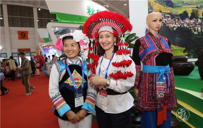(一名外國女客商在云南主題展區(qū)被特色濃郁的民族文化所吸引。)