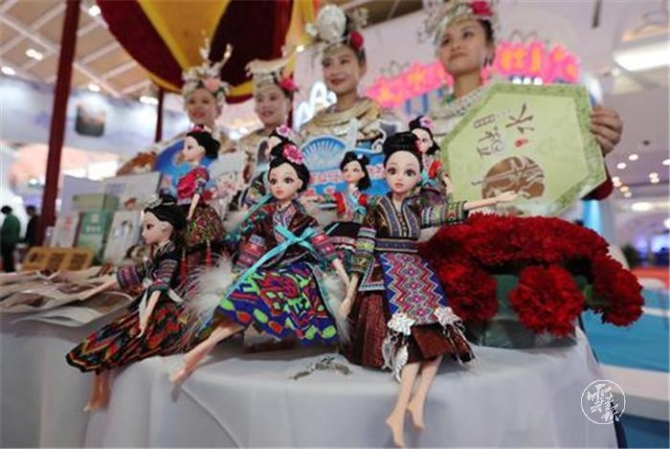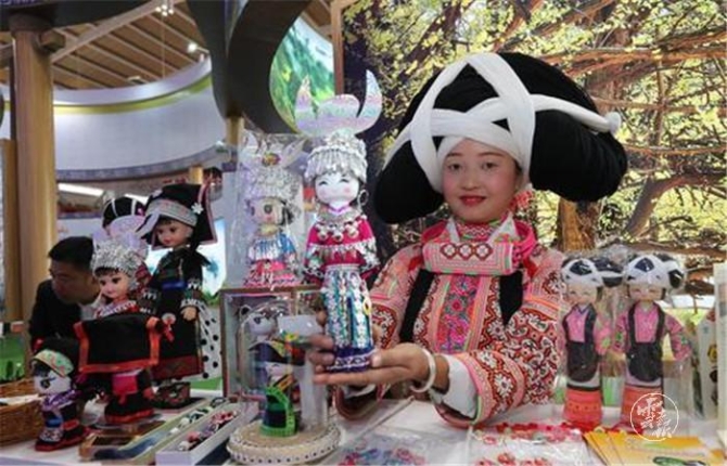 (貴州展區(qū)展示推介梭嘎苗族文創(chuàng)工藝品。)