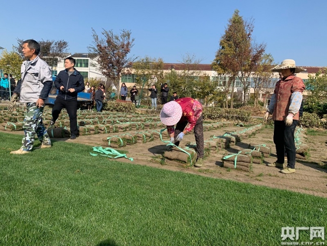 村民正在對草皮進行捆扎(央廣網(wǎng)記者 孫冰潔 攝)