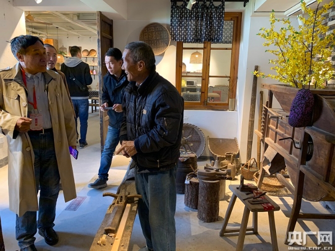 梅林村匠心鋪內(nèi)的本地工匠正向游客展示其所做的手工藝品(央廣網(wǎng)記者 孫冰潔 攝)