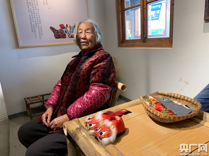 村民丁奶奶與其手工縫制的虎頭鞋(央廣網(wǎng)記者 孫冰潔 攝)