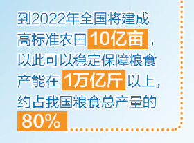 近日,國務(wù)院辦公廳印發(fā)《關(guān)于切實(shí)加強(qiáng)高標(biāo)準(zhǔn)農(nóng)田建設(shè)提升國家糧食安全保障能力的意見》(以下簡稱《意見》)。在11月25日國新辦舉行的國務(wù)院政策例行吹風(fēng)會上,農(nóng)業(yè)農(nóng)村部副部長余欣榮表示,按照《意見》,到2022年全國將建成高標(biāo)準(zhǔn)農(nóng)田10億畝,以此可以穩(wěn)定保障糧食產(chǎn)能在1萬億斤以上,約占我國糧食總產(chǎn)量的80%。