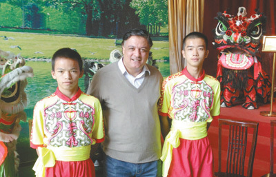 圖為納賽爾·阿卜杜·阿勒(中)與中國(guó)舞獅隊(duì)少年合影。