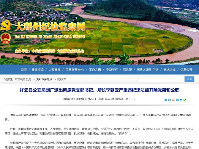李朝云嚴(yán)重違反了中央八項(xiàng)規(guī)定精神和黨的組織紀(jì)律、廉潔紀(jì)律、群眾紀(jì)律并涉嫌徇私枉法罪和包庇、縱容黑社會(huì)性質(zhì)組織罪,性質(zhì)惡劣,情節(jié)嚴(yán)重,應(yīng)予嚴(yán)肅處理。依據(jù)《中國(guó)共產(chǎn)黨紀(jì)律處分條例》《中華人民共和國(guó)監(jiān)察法》等有關(guān)規(guī)定,經(jīng)中共祥云縣紀(jì)委常委會(huì)議和縣監(jiān)委委員會(huì)議研究,并報(bào)中共祥云縣委批準(zhǔn),決定給予李朝云開除黨籍、開除公職處分,其涉嫌犯罪問(wèn)題移送檢察機(jī)關(guān)依法審查起訴。