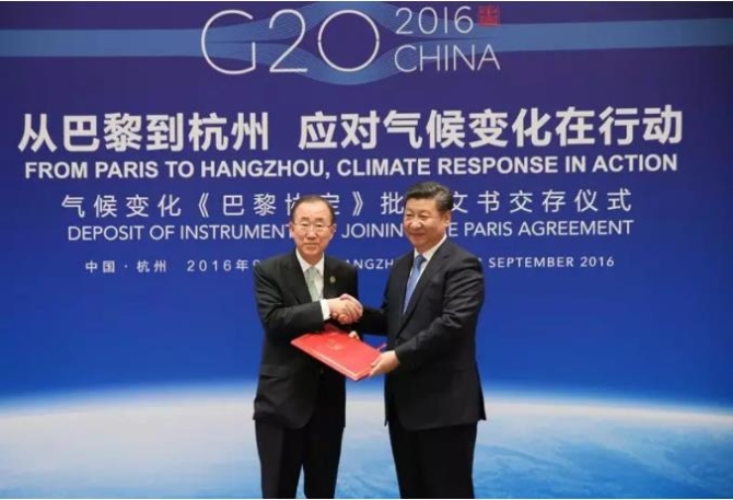 △2016年,習(xí)近平向潘基文交存中國(guó)氣候變化《巴黎協(xié)定》批準(zhǔn)文書(shū)。