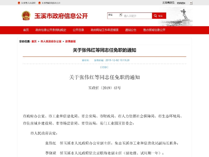 張偉紅 任玉溪市人民政府辦公室副主任,免去玉溪市工業(yè)和信息化局副局長職務;