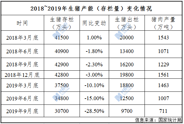 來自國家統(tǒng)計(jì)局的數(shù)據(jù)顯示,截至2018年3月底、6月底、9月底、12月底,生豬存欄數(shù)量分別為:4.15億頭、4.09億頭、4.29億頭、4.28億頭,同比變化波動(dòng)在-3.0%~1.0%之間。而進(jìn)入2019年后,波動(dòng)的幅度在快速增加,截至2019年3月底、6月底、9月底生豬存欄數(shù)量分別為:3.75億頭、3.48億頭、3.07億頭,同比變化分比為:-10.1%、-15.0%、-28.5%。