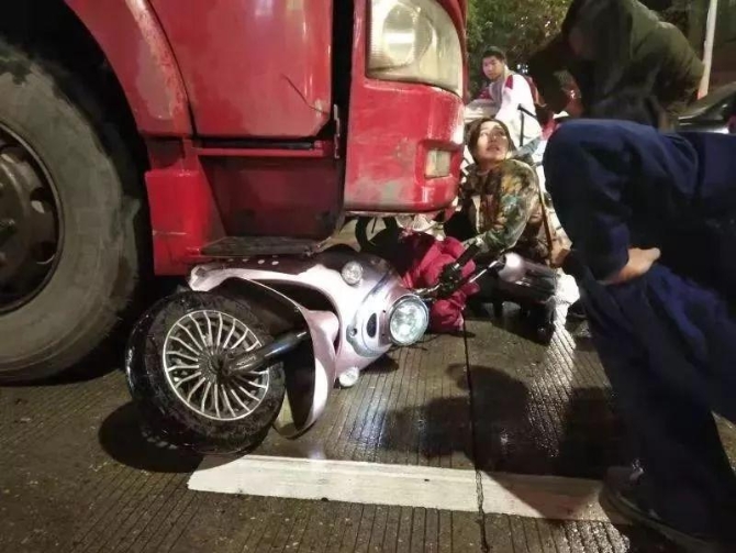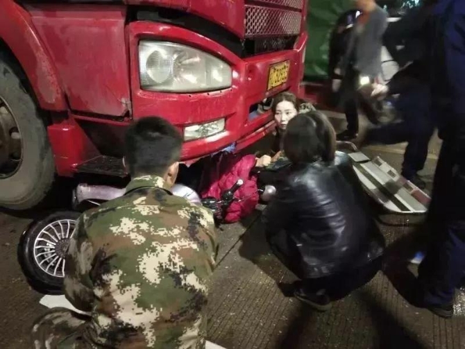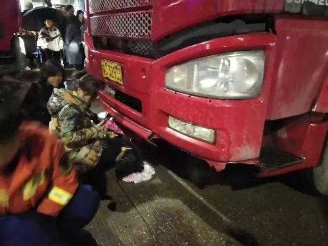 一名女子被壓在大貨車下面,