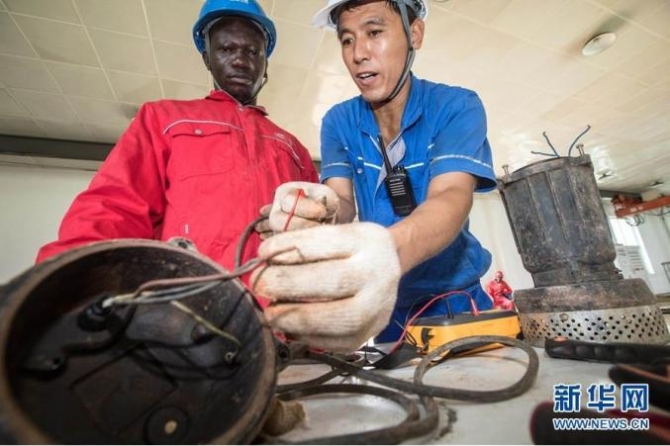 污水處理廠的中國(guó)員工向當(dāng)?shù)毓と藗魇诰S修技巧|新華社