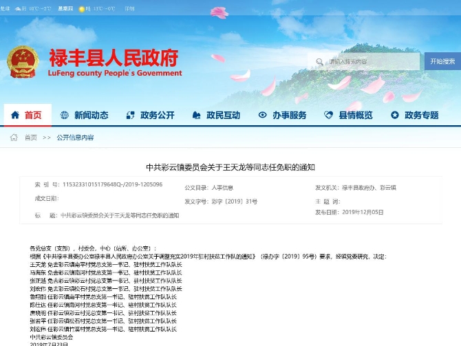 王天龍 免去彩云鎮(zhèn)南平村黨總支第一書記、駐村扶貧工作隊隊長