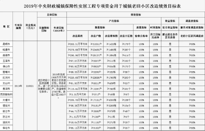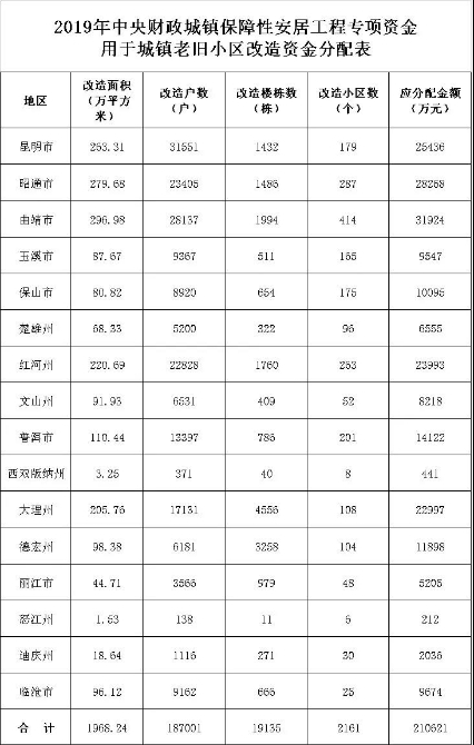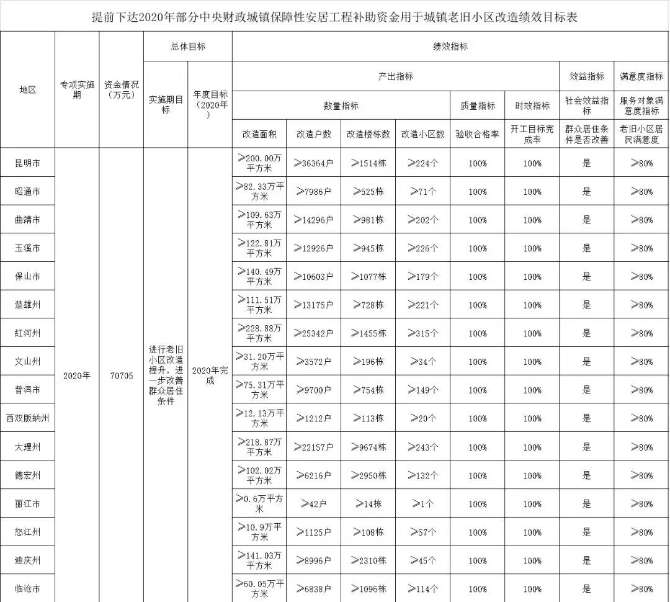 其中,曲靖市的改造面積最多,共296.98萬平方米,改造戶數(shù)28137戶,改造樓棟1994棟,改造小區(qū)414個,應(yīng)分配金額31924萬元。