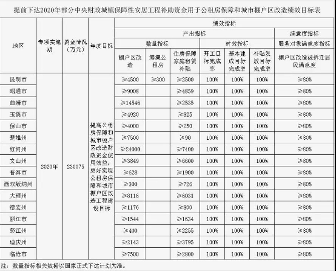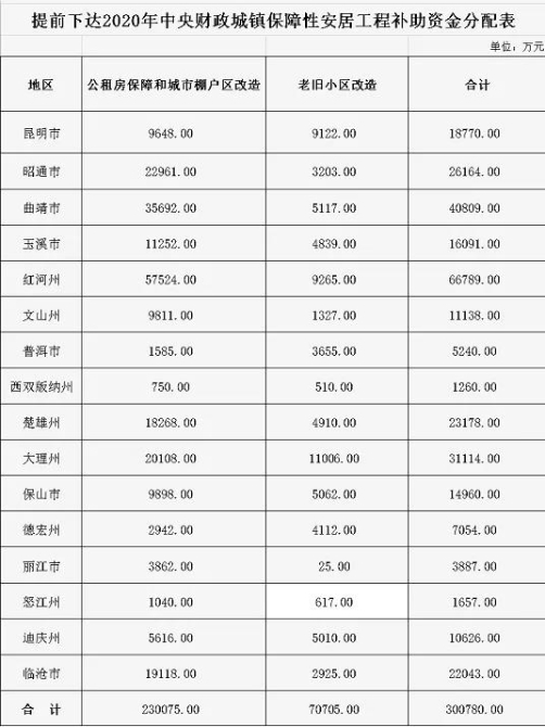 根據(jù)《通知二》,提前下達(dá)2020年部分中央財政城鎮(zhèn)保障性安居工程補助資金分配金額共300780萬元,用于云南省16個州(市)的公租房和城市棚戶區(qū)改造、老舊小區(qū)改造。