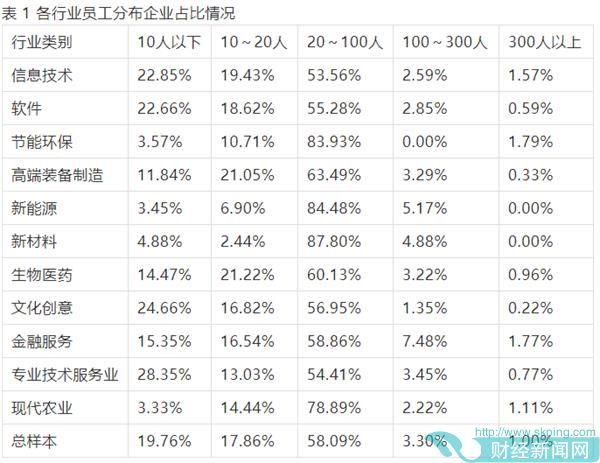 分行業(yè)來(lái)看,金融服務(wù)行業(yè)員工人數(shù)在100人以上的創(chuàng)業(yè)企業(yè)數(shù)中占比最高,達(dá)9.25%,其中,100人至300人的企業(yè)達(dá)7.48%,300人以上的企業(yè)達(dá)1.77%,均高于總樣本水平。信息技術(shù)行業(yè)、文化創(chuàng)意行業(yè)、專業(yè)技術(shù)行業(yè)和軟件行業(yè)20人以下的創(chuàng)業(yè)企業(yè)數(shù)比重均明顯高于總樣本水平,分別占各行業(yè)企業(yè)數(shù)量的42.28%、41.48%、41.38%和41.28%。而新材料、新能源和節(jié)能環(huán)保行業(yè)的創(chuàng)業(yè)企業(yè)人數(shù)更為明顯地集中在20人至100人的區(qū)間內(nèi),占比分別為87.80%、84.48%和83.93%。