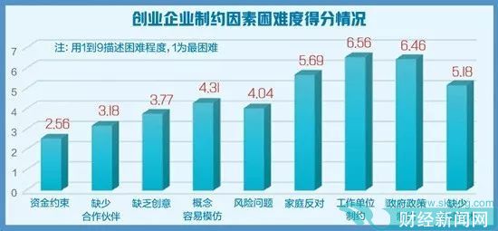 經(jīng)濟(jì)日?qǐng)?bào)社中國(guó)經(jīng)濟(jì)趨勢(shì)研究院、中國(guó)社科院數(shù)量經(jīng)濟(jì)與技術(shù)經(jīng)濟(jì)研究所共同編制的《創(chuàng)業(yè)企業(yè)調(diào)查(二期)報(bào)告》顯示,困難度加權(quán)綜合打分分析結(jié)果與以上分析基本一致。通過(guò)對(duì)9個(gè)因素困難度排序,由高到低依次賦予相關(guān)分?jǐn)?shù),再根據(jù)各因素不同困難度創(chuàng)業(yè)者所選比重加權(quán),求得困難度的綜合得分。測(cè)算顯示,“資金約束”“缺少合作伙伴”和“缺乏創(chuàng)意”分別得分為2.56分、3.18分和3.77分,位于最低層次;“風(fēng)險(xiǎn)問(wèn)題”“概念容易模仿”和“缺少關(guān)鍵技術(shù)”綜合得分分別為4.04分、4.31分和5.18分;“家庭反對(duì)”“政府政策制約”和“工作單位制約”綜合得分分別為5.69分、6.46分和6.56分,得分最高,對(duì)創(chuàng)業(yè)的影響最小。