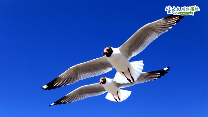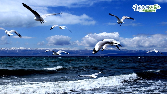 在青海湖濕地,鳥群肆意翱翔。