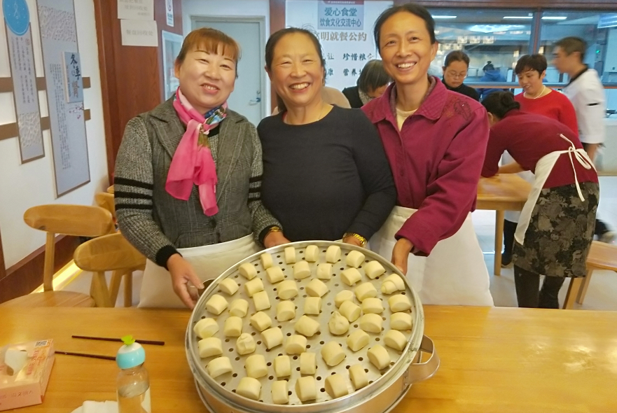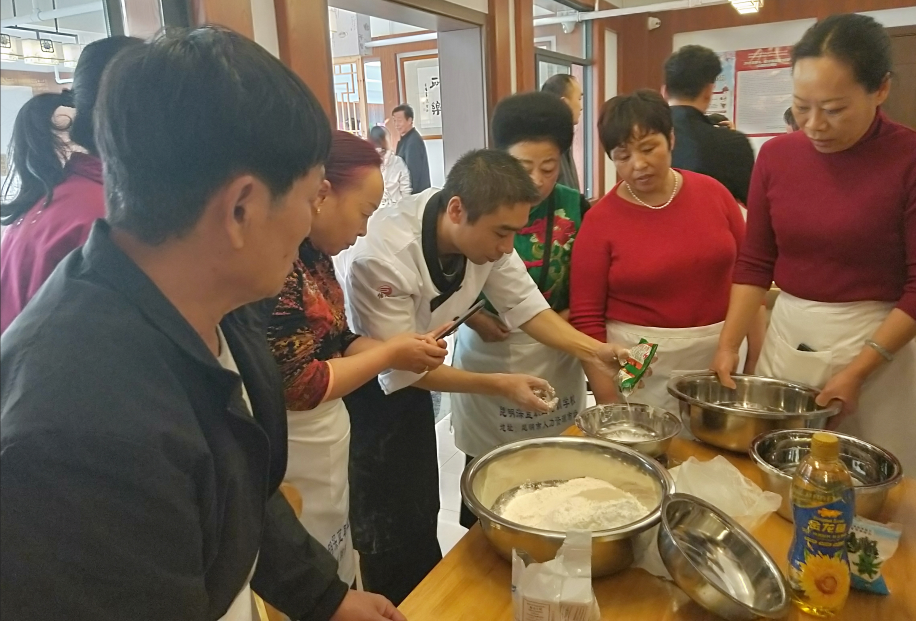培訓邀請了中式高級烹調(diào)師秦偉老師為職工們培訓。培訓中,職工們每六人自愿結成小組,團結合作。面點老師首先向大家講解了制作面點所需的原材料及搭配比例,接著親自示范了饅頭、花卷等面點的制作過程,最后對每個小組挨個兒、手把手地進行教學。