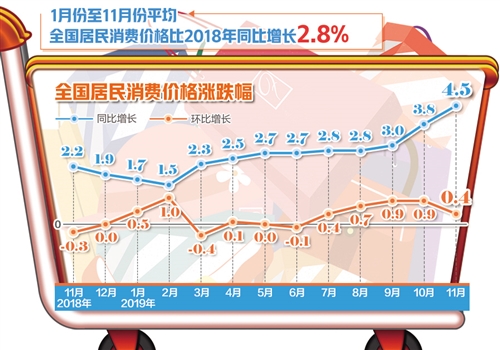 11月份,CPI同比上漲4.5%,漲幅比上月擴(kuò)大0.7個(gè)百分點(diǎn),處于相對(duì)高點(diǎn)。不過(guò),前11個(gè)月平均,CPI同比上漲2.8%。