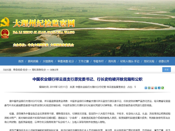 昆明信息港訊 機(jī)器人小明 據(jù)中國農(nóng)業(yè)銀行大理州分行紀(jì)委、祥云縣監(jiān)察委員會消息:中國農(nóng)業(yè)銀行云南省大理州祥云縣支行原黨委書記、行長史鈞涉嫌嚴(yán)重違紀(jì)違法,經(jīng)云南省紀(jì)委監(jiān)委與中央紀(jì)委國家監(jiān)委駐中國農(nóng)業(yè)銀行紀(jì)檢監(jiān)察組協(xié)調(diào),中國農(nóng)業(yè)銀行大理州分行紀(jì)委對其進(jìn)行紀(jì)律審查,祥云縣監(jiān)察委員會對其進(jìn)行監(jiān)察調(diào)查。