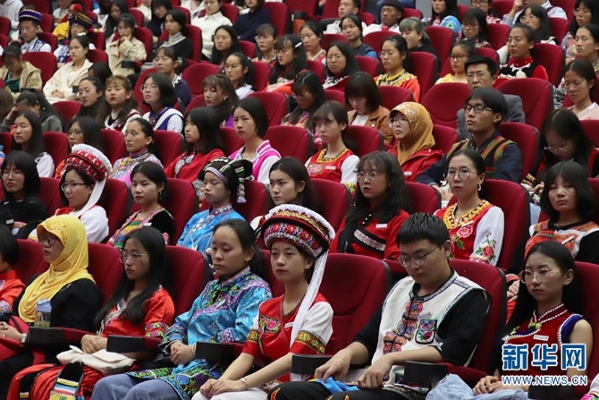 云南民族大學(xué)學(xué)生著各民族服飾觀看電影《為國而歌》。