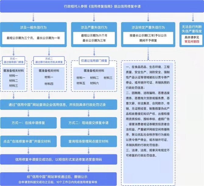 “信用修復”就是指失信主體被有關部門聯(lián)合懲戒、納入黑名單之后,失信人對自己的失信行為有正確的認識,并在規(guī)定的時間內(nèi)采取有效措施進行及時糾正,繼而消除不良社會影響后果的一種措施。
