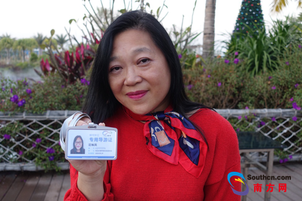 澳門籍導(dǎo)游向記者展示“橫琴新區(qū)專用導(dǎo)游證”。吳詩(shī)航攝