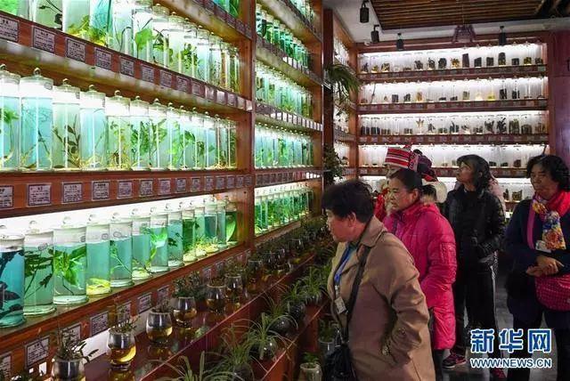 游客在石林杏林大觀園中醫(yī)文化展覽館參觀了解各種中藥原料
