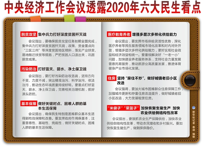 新華社北京12月12日電 保障和改善民生是經濟社會發(fā)展的出發(fā)點和落腳點,也是全面建成小康社會的核心要義所在。12月10日至12日在北京舉行的中央經濟工作會議提出,明年是全面建成小康社會和“十三五”規(guī)劃收官之年。圍繞人民群眾關心的熱點問題,這次會議提出了諸多民生舉措。