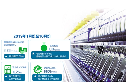 2019年1月份至10月份,我國規(guī)模以上輕工企業(yè)實(shí)現(xiàn)營業(yè)收入16.05萬億元,同比增長3.89%,增速低于全國工業(yè)0.31個(gè)百分點(diǎn);實(shí)現(xiàn)利潤1.01萬億元,同比增長10.03%,增速高于全國工業(yè)12.93個(gè)百分點(diǎn);營業(yè)收入利潤率6.26%,高于全國工業(yè)0.41個(gè)百分點(diǎn),充分彰顯出輕工業(yè)發(fā)展韌性。