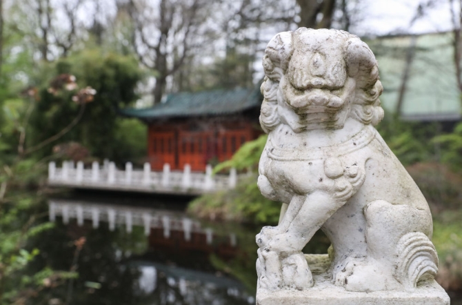 這是4月7日在德國(guó)杜伊斯堡郢趣園內(nèi)拍攝的橋上石獅。(新華社記者單宇琦攝)