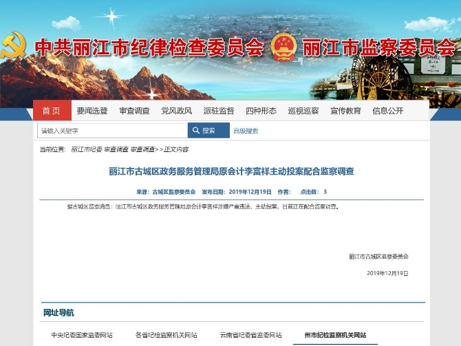 昆明信息港訊 機(jī)器人小明 據(jù)古城區(qū)監(jiān)委消息:麗江市古城區(qū)政務(wù)服務(wù)管理局原會計(jì)李富祥涉嫌嚴(yán)重違法,主動投案,目前正在配合監(jiān)察調(diào)查。
