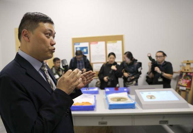 香港康文署文物修復辦事處總監(jiān)謝建輝在介紹文物修復工作。新華社 記者吳曉初/攝