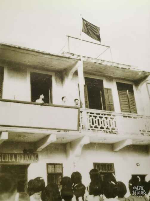 △1949年10月1日,濠江中學(xué)校長(zhǎng)杜嵐沖破重重阻力,帶領(lǐng)師生在學(xué)校升起了第一面五星紅旗。(資料圖)