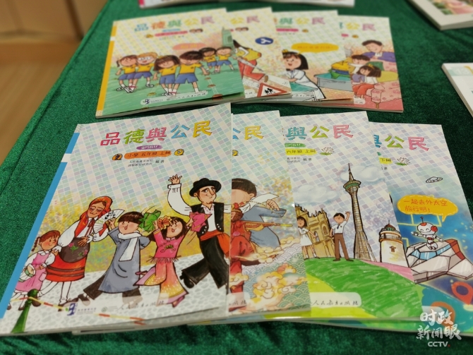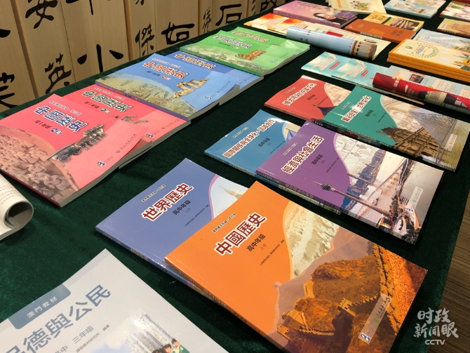 △在英才學(xué)校圖書館展臺(tái)上,擺放著《品德與公民》、《中國(guó)歷史》等澳門特別行政區(qū)政府和內(nèi)地合編的教材。(央視記者郭曉龍拍攝)